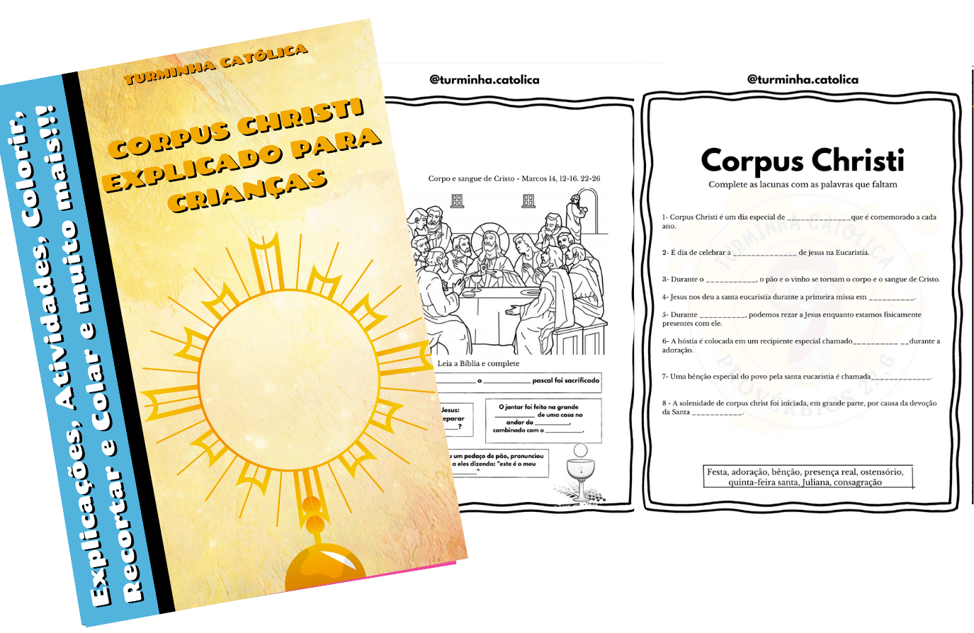 O Pão da Vida Explicação sobre a Eucaristia com atividades de colorir e dinâmicas lúdicas sobre a Procissão. Material visual pronto para imprimir que ensina o mistério da Presença Real de forma simples.