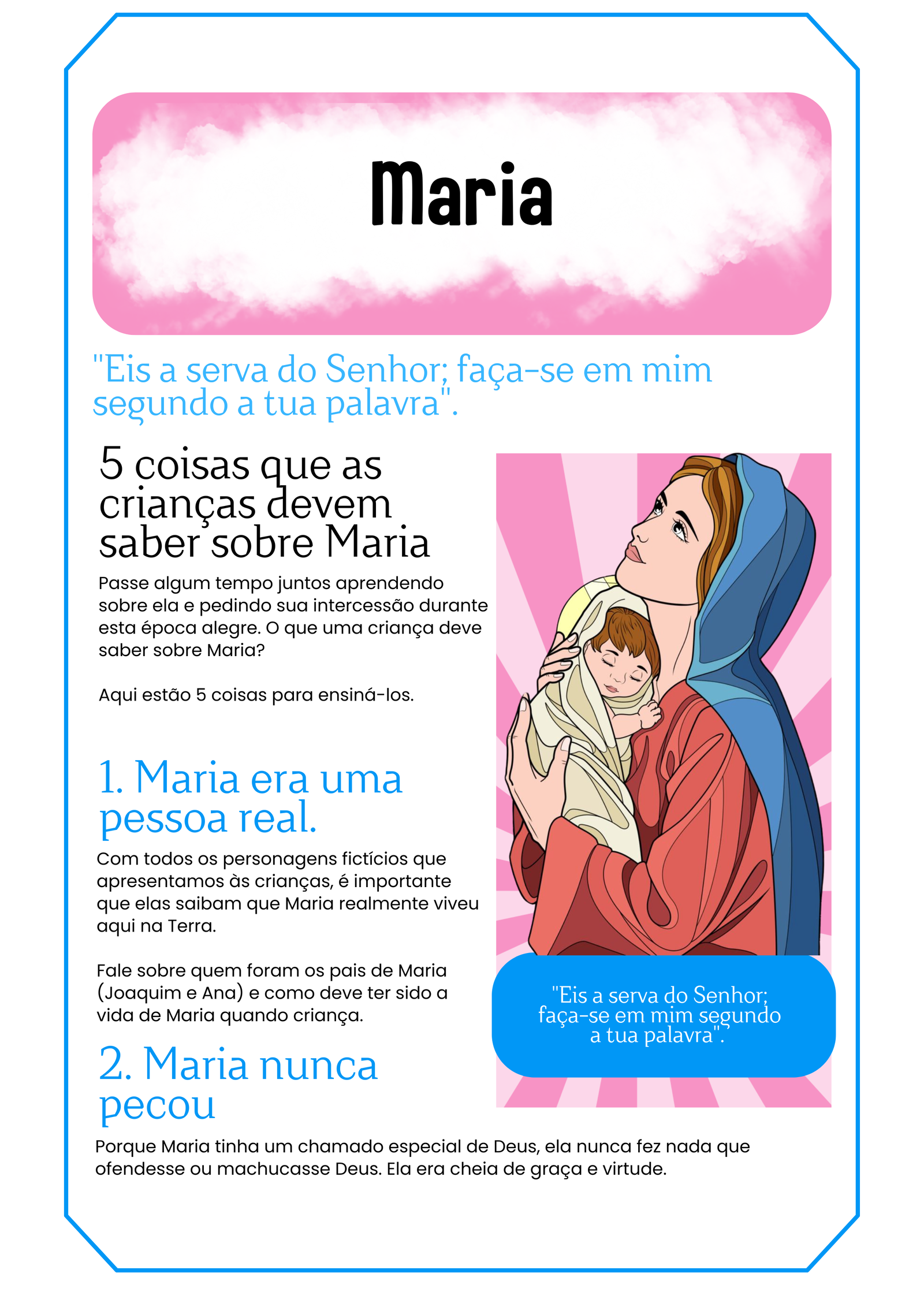 De forma doce e sensível, você apresenta a vida, as virtudes e o amor de Nossa Senhora, com atividades lúdicas, dinâmicas e muito mais.